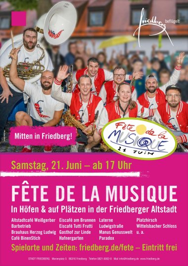 Die Welt macht Musik. Immer. Ganz besonders aber zum längsten Tag des Jahres, zum Sommeranfang am 21. Juni. Die Fête de la Musique, das Fest der Musik, findet an diesem Termin jährlich in hunderten Städten weltweit statt. Die Stadt Friedberg beteiligt sich seit 2015 an dieser einzigartigen Aktion, die Anfang der 1980er-Jahre in Frankreich ins Leben gerufen wurde.Auch 2025 wird die Innenstadt wieder zur Bühne: Am Samstag, den 21. Juni, von 17:00 bis 22:30 Uhr, bringt die Fête de la Musique