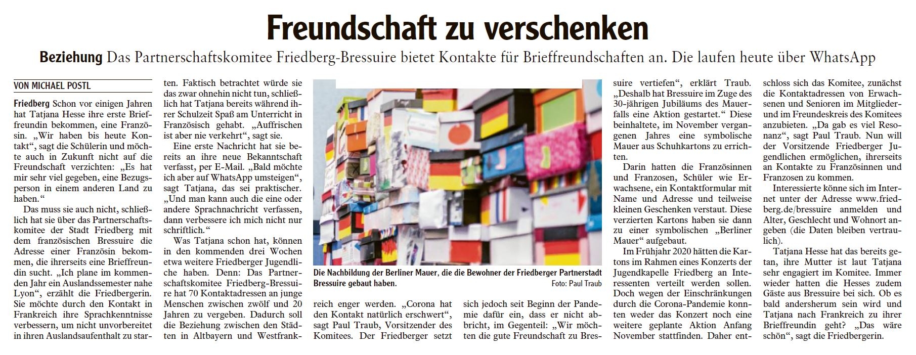 Wie bereits auf der Jugenseite der Friedberger Allgemeinen Zeitung berichtet (s. Artikel im Anhang), vermittelt das Komitee französische Kontaktadressen an die entsprechende Zielgruppe in Friedberg. Hintergrund ist die orginelle Veranstaltung unserer Partnerstadt Bressuire zum 30-jährigen Jahrestag des Berliner Mauerfalls. Eigentlich sollten die Adressen bereits im März diesen Jahres im Rahmen eines Jugendkonzerts verteilt werden, doch coronabedingt konnten diese und weitere dafür geplanten öffentliche Veranstaltungen nicht mehr durchgeführt werden.
