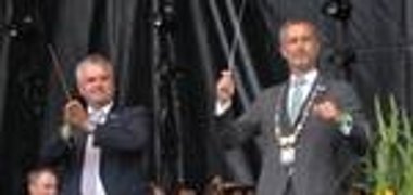 Mit zwei Bussen und einer 130-köpfigen Delegation war man unter der Leitung von Bürgermeister Roland Eichmann und Vize Richard Scharold angereist und schnell in das dreitägige Stadtfest integriert, das bei herrlichem Wetter als „Open Air“ auf dem Hauptplatz abgebrannt wurde. Vertreter des Stadtrates, Landratsstellvertreter Manfred Losinger, Mitglieder des Partnerschaftskomitees, der Veteranen, der Sänger, der Schützen, der Stadt- und Jugendkapelle sowie langjährige Freunde und auch eine Radlergruppe aus der Lechrainstadt waren dem Aufruf des neuen Bürgermeister Wolfgang Zingl und seines rührigen und quirligen „Außenministers“ Roland Gressenbauer zum Mitfeiern gefolgt.