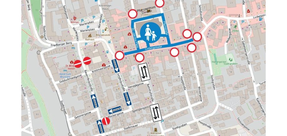 Die Ludwigstraße wird zwischen Stadtgraben und Jungbräustraße für Fahrzeuge gesperrt. Die Absperrungen dafür werden vom Bauhof unter der Woche gegen 15 Uhr aufgebaut. Spätestens ab 16 Uhr sind die Durchfahrt sowie Ein- und Ausfahrten in diesem Teil der Ludwigstraße nicht mehr möglich. Gegen 21 Uhr wird die Absperrung rückgebaut und der Verkehr kann wieder durchfahren.